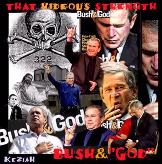 While the Empire parades its pretentious self righteousness in the name of Christ, the Son of God, the Arab world has no such illusions; that Hideous Strength, in their eyes, is no less than the ³Great Satan². Why? Because Satan poses as an Angel of Light, attempts to usurp the Throne of God, twists truth into a lie, and exploits the poor and the weak for gain. President Bush is waging unending pre-emptive wars in the name of Christianity, while all the time he remains an active member of a satanic cult with aspirations of global domination. By supporting the great deception of this Hideous Strength, the undiscerning faithful are doing the true Christ the greatest injustice of all.