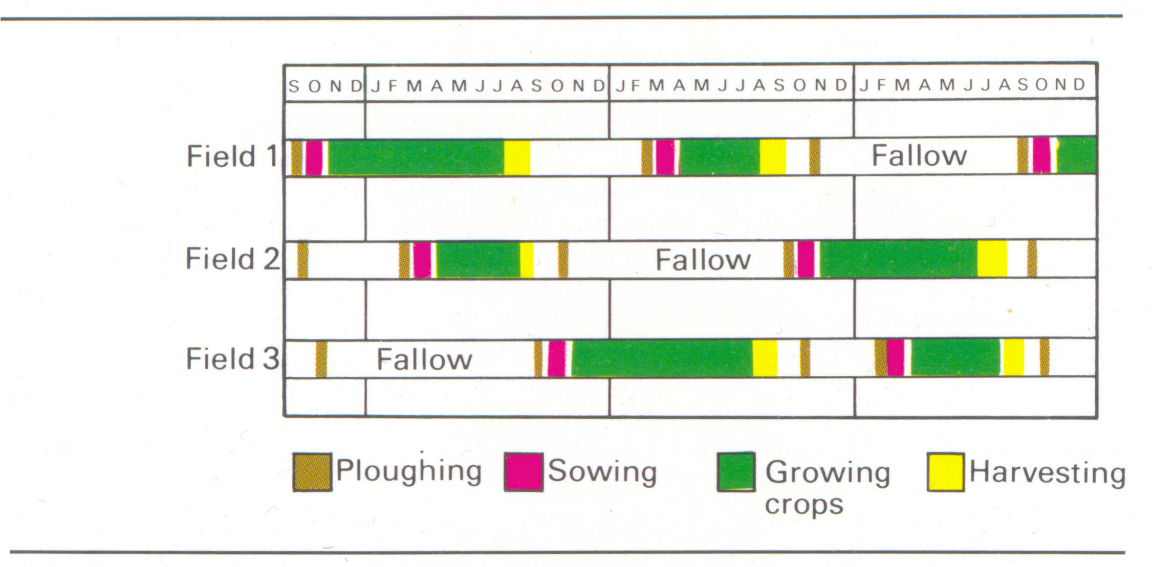 In open-field villages the freedom of the individual farmer was limited by the need to conform to communal routine, for his lands were intermingled and interlocked with those of other tenements. Under an orthodox, three-field system, each field would experience a three-year rotation consisting of winter-sown crops (wheat and rye), spring-sown crops (oats or barley) and fallow.