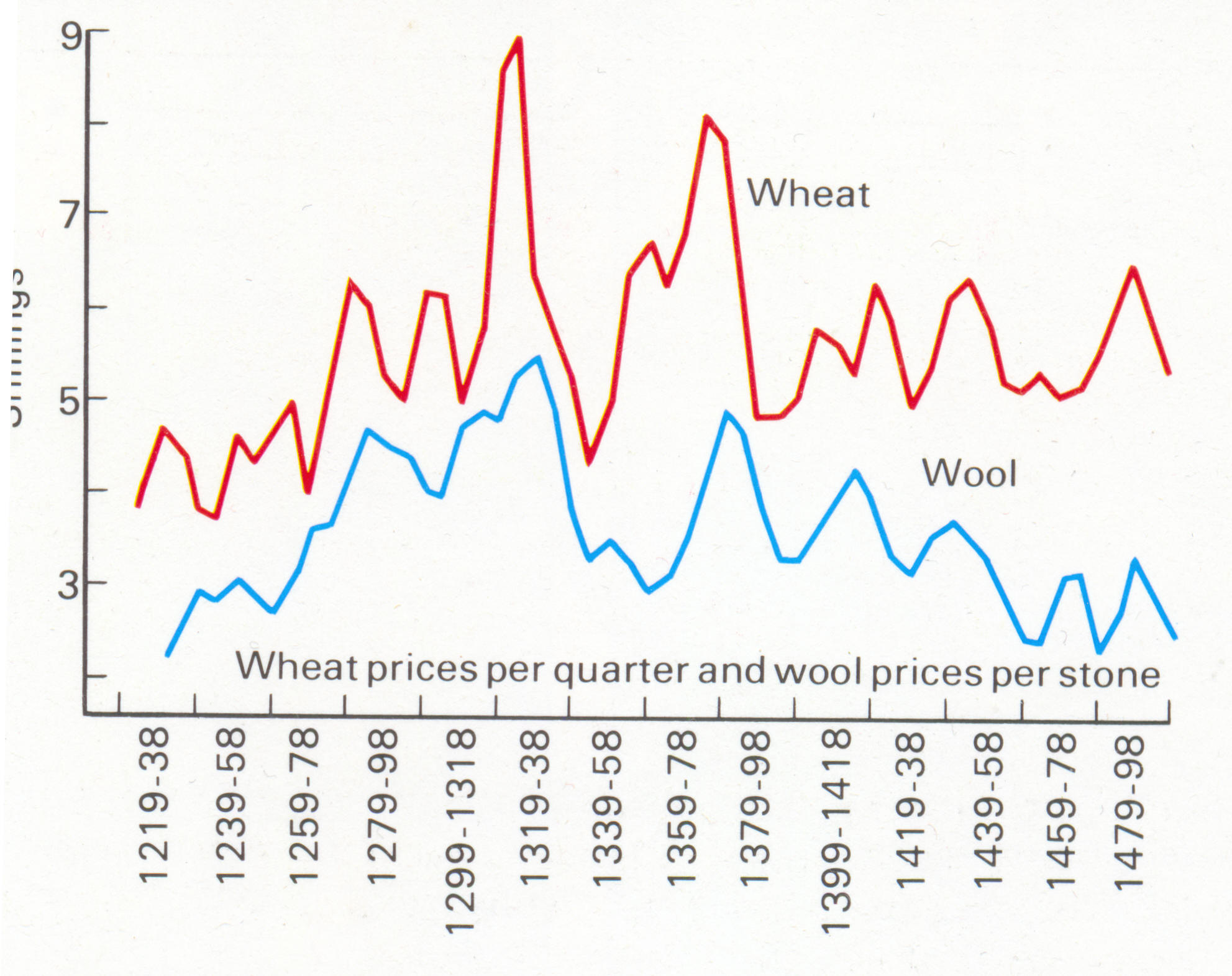 The underlying trends revealed by this graph show steadily rising prices both for wheat and wool during the 13th century followed by a period of stable or declining prices in the following two centuries.